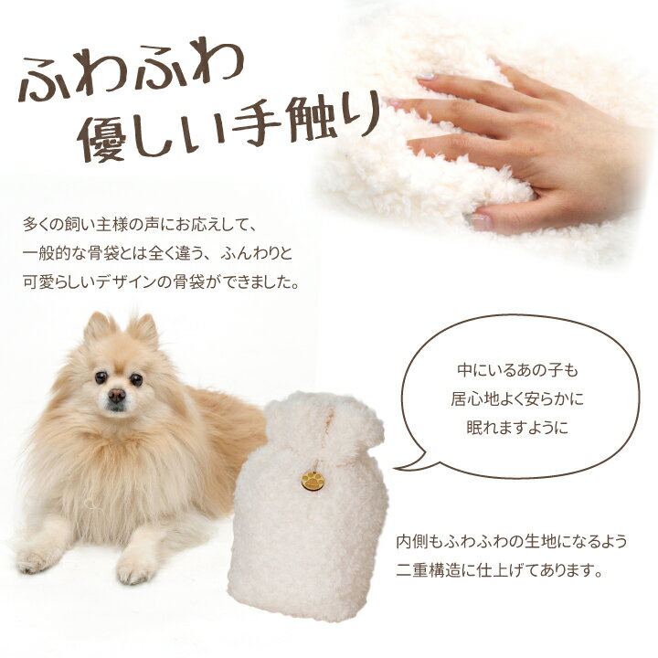 骨袋は、ふわりと柔らかく、なめらかな手触りの、ペットちゃんの温かみを思い出すような“ふわふわ・もこもこ”の作りです。