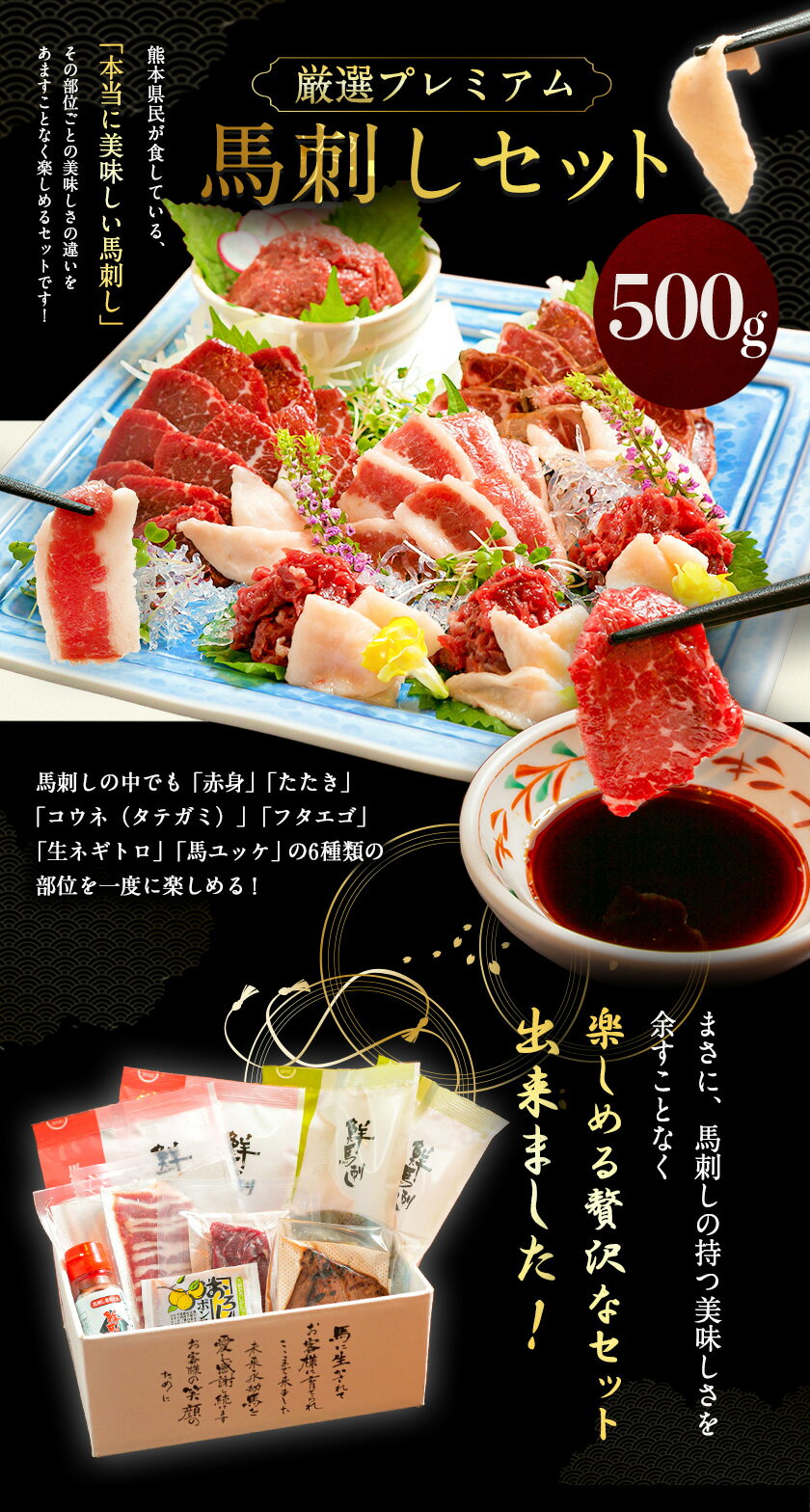 商品情報 厳選プレミアム馬刺しセット 500g 産地 カナダ/フランス産/国産 内容量 赤身ブロック100g、タタキブロック100g、コウネ(タテガミ)スライス40g、フタエゴスライス40g、生ネギトロ60g×2、線切り(ユッケ)50g×2、鮮馬刺しのたれ50ml、おろしポン酢20g、ユッケのたれ15g×2 配送方法 冷凍便でお届けします。