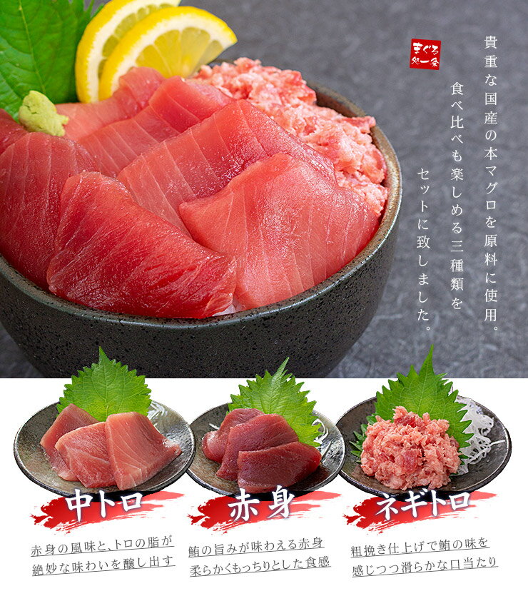 商品説明 内容 天然本鮪3種セット(中トロ・赤身・ネギトロ) 内容量 中トロ150g、赤身150g、ネギトロ150g 賞味期限 冷凍庫保存で約1週間、解凍後即日。