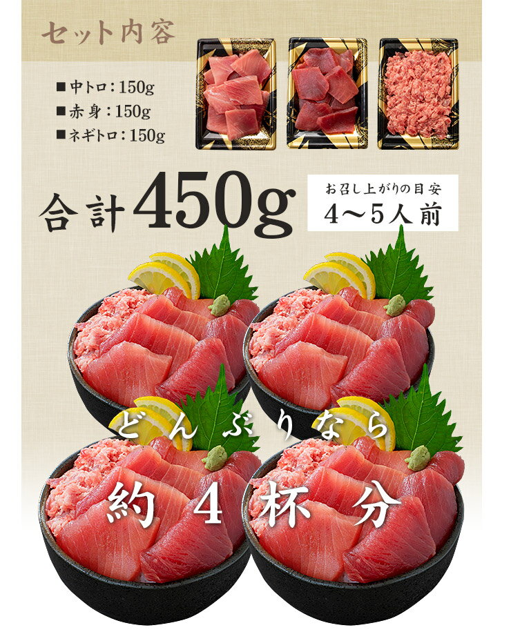 天然本鮪 三種セット(計450g) 中トロ・赤身・ネギトロ 各150gパック 送料無料 8,980円(税込)
