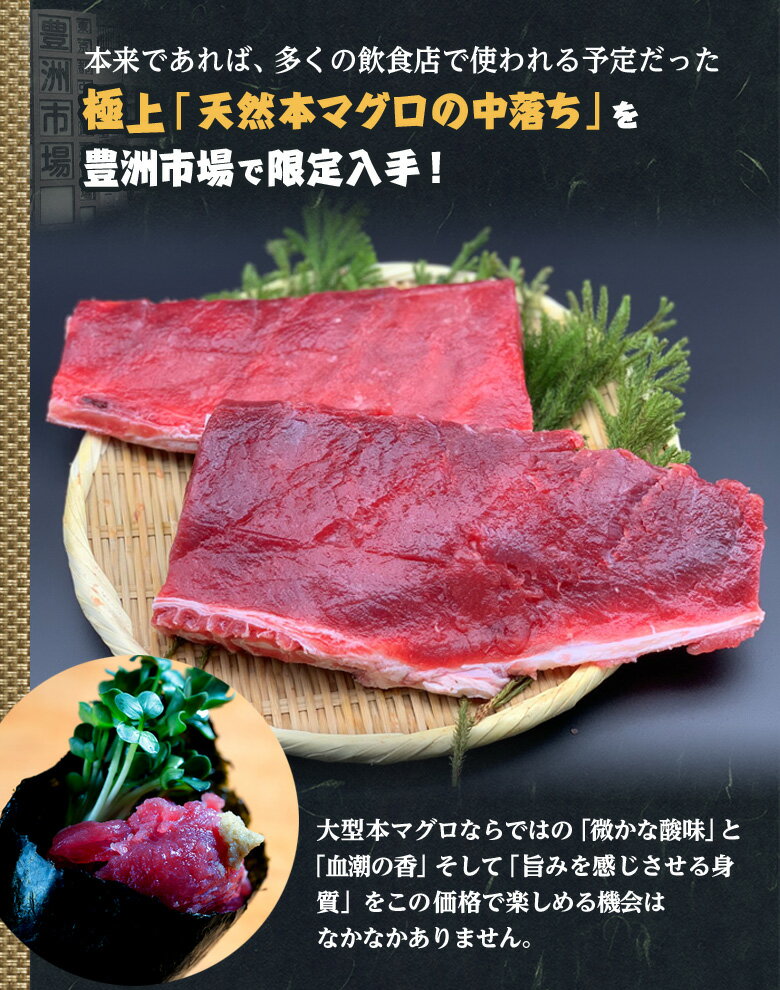 商品説明本来であれば、多くの飲食店で使われる予定だった、極上「天然本マグロの中落ち」を豊洲市場で限定入手!大型本マグロならではの、「微かな酸味」と「血潮の香」、そして「旨みを感じさせる身質」をこの価格で楽しめる機会はなかなかありません。