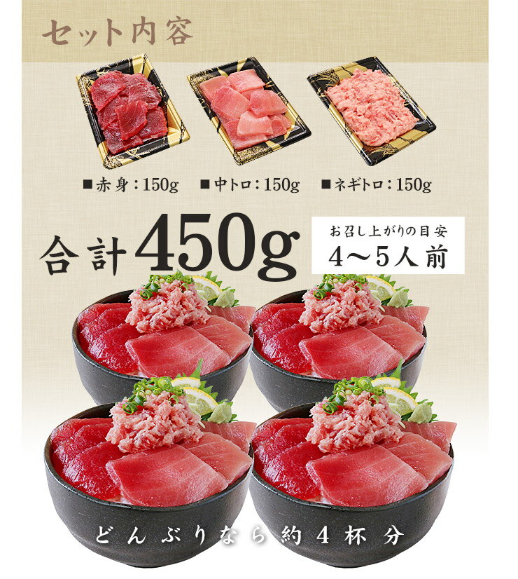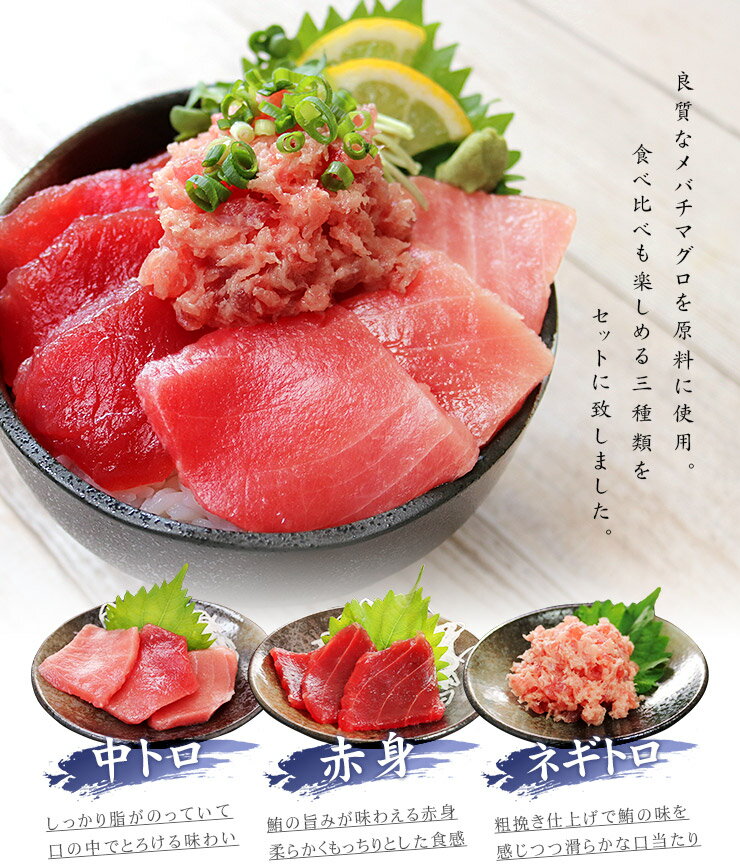 商品説明 内容 メバチ鮪3種セット(中トロ・赤身・ネギトロ) 内容量 中トロ150g、赤身150g、ネギトロ150g 賞味期限 冷凍庫保存で約1週間、解凍後即日。